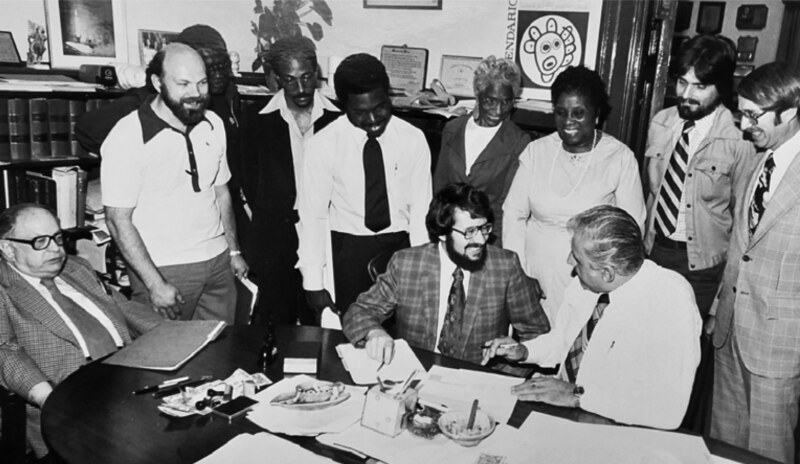 Pictured: Diamond Street Mennonite Church and community members at City Hall signing papers to receive the large building from the city under their Gift Property program. Pastor Freeman Miller (middle) signing the papers in 1979.